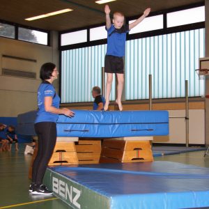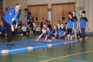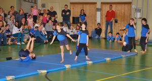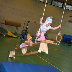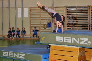 Den Anfang machten die 4-6Jährigen, die bei Winterspielen im Turnsaal (Schneeballschlacht, Bobfahren,…etc.) ihren Spaß hatten. Im Anschluss zeigten die 7-11Jährigen, was sie im Gerätturnen schon alles gelernt haben. Sektionsleiterin Manuela Kiesl lud zu einem kurzen Mitmachturnen mit Steppper und Hanteln. Beim Eltern-Kind-Turnen durften die Geräteaufbauten von allen genutzt werden, und viele – auch gr0ße Kinder – hatten ihre Freude mit all den Bewegungslandschaften. Danach tanzten einige der 7-11jährigen Mädchen, und das Finale bestritten die erwachsenen und jugendlichen GerätturnerInnen, die auf Boden, Trampolin, Reck und Barren zeigten, was mit Übung und Ehrgeiz Erstaunliches zu schaffen ist.