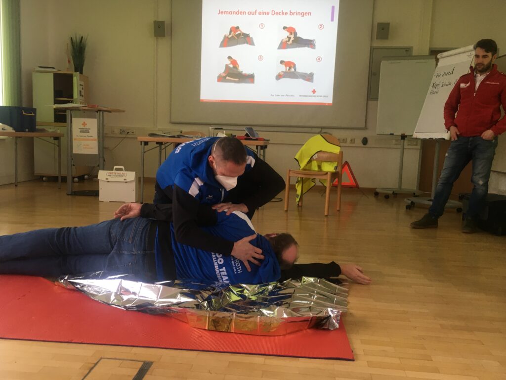 Der Kurs enthielt nicht nur viel theoretisches Wissen, sondern unsere 15 Teilnehmer:innen mussten oft auch selbst Hand anlegen, da geübt wurde, wie man Verletzte umdreht, in Decken einwickelt, beatmet, und wie man mit dem Defibrillator umgeht. Bei der Herzdruck-Massage zeigten unsere Trainer:innen große Ausdauer und gutes Rhythmusgefühl, als sie synchron zu „Stayin‘ alive“ ihre Puppen reanimierten.