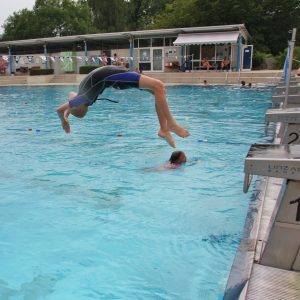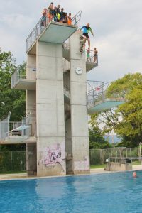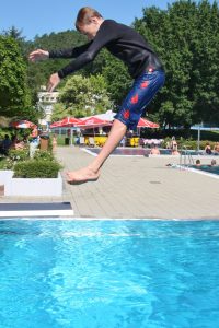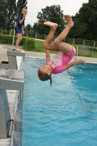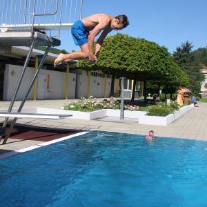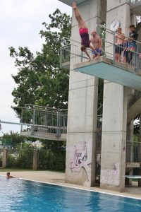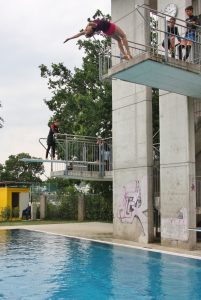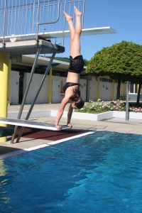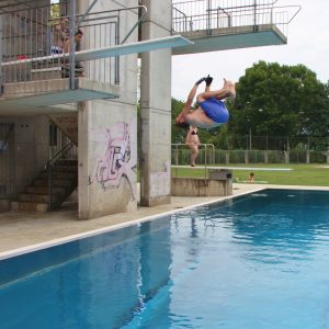 Lange ist die Sommerpause! Damit den TurnerInnen nicht fad wird und sie nicht alles verlernen, toben sie sich im Freibad Gallneukirchen (und ab und an auch im Parkbad Linz) beim Wasserspringen aus. Ja, dazu braucht es Mut. Und manchmal auch Schmerzresistenz – aber das kennen sie eh vom Turnen auch.
